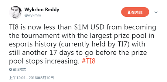 距离TI8总奖金池停止积累还有17天的时间,而目前的TI8奖金已经达到了2381万美元之多,距离由TI7创下的电子竞技赛事最高奖金只有不到100万美元的差距。