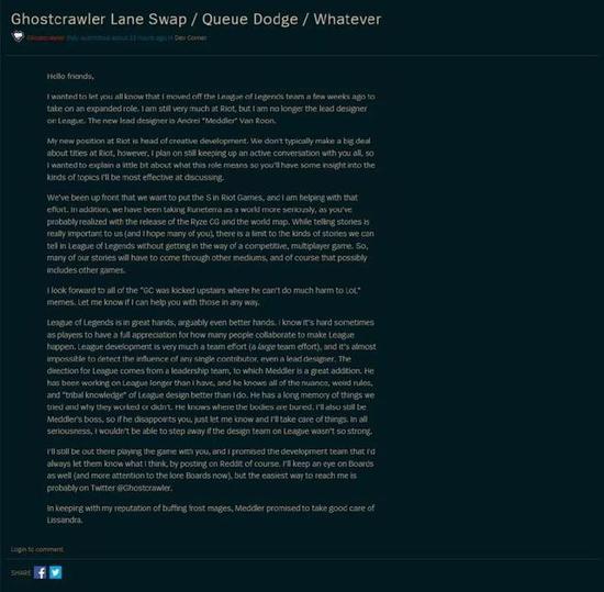 就在前几日,作为前《英雄联盟》首席设计师的鬼蟹,在美服论坛上发表文章,表示自己已不再担任《英雄联盟》首席设计师,接任他的人是Andrei“Meddler”Van Roon。
