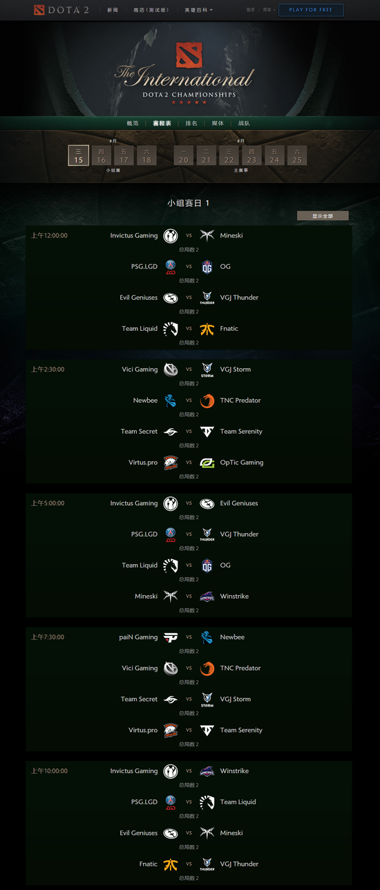 在小组赛分组公布之后,每天的赛程表也已经出炉。小组赛首日将进行20个BO2的比赛,其中A组进行12场,B组进行8场,从8月16日的0点一直打到12点(当然了,电子竞技没有准时,不论是提前开始还是延迟结束都有可能)