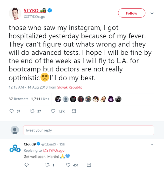 战队中的STYKO一直以来也是众人关心的焦点,在加入C9以来也是只上场了两场比赛,随后就坐上了替补席的位置。C9战队前不久才宣布因为人手不够,继续让STYKO随战队参加9月的赛事,这对于STYKO来说是一次可遇不可求的好机会,可是祸不单行,STYKO发推称自己发烧住院,具体病情还不清楚,本周能不能参加集训以及会不会影响他未来的比赛都是个未知数,而C9也是在底下留言希望STYKO可以快点好起来。虽然说人情已到份上了,但是STYKO如果仍未抓住机会,可能C9放人也是板上钉钉了。