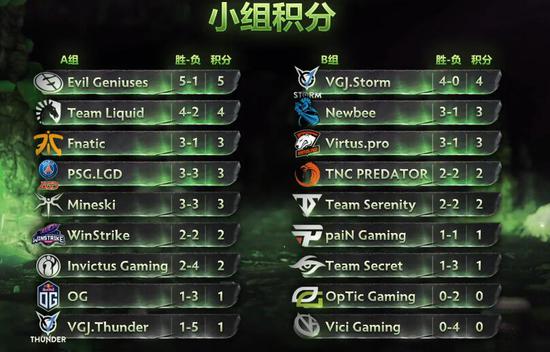 iG则对上了前几轮发挥不佳的winstrike,iG的骷髅王体系有些僵硬,被winstrike二比零带走,VGJ.T则是对上了Fnatic,感觉还是VGJ,T的硬实力不行,被Fnatci两局死灵龙轻松带走。EG则是继续一路凯歌二比零击败Mineski,不得不说这次EG的表现和几个月前判若两人。