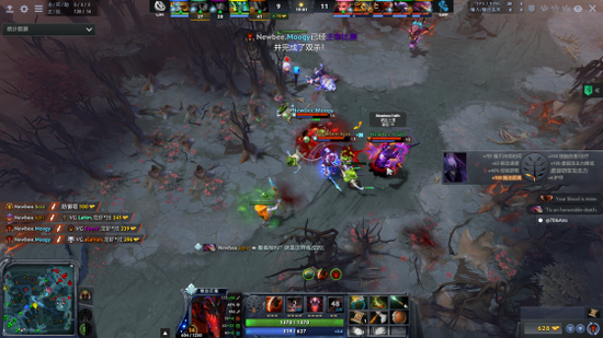 首局VG选出死灵法加幻影长矛手(猴子)双核,上路是白虎加暗影恶魔“关箭”组合。Newbee拿出血魔加骨弓,并同时启用两位新英雄。开局对线期VG上下两路多点开花,中路死灵法正反补也是压制了骨弓,VG久违的拿到了梦幻开局。占据优势VG开启推进模式,可当Newbee英雄等级提升后,小节奏不断,局面也慢慢向着Newbee倾斜。