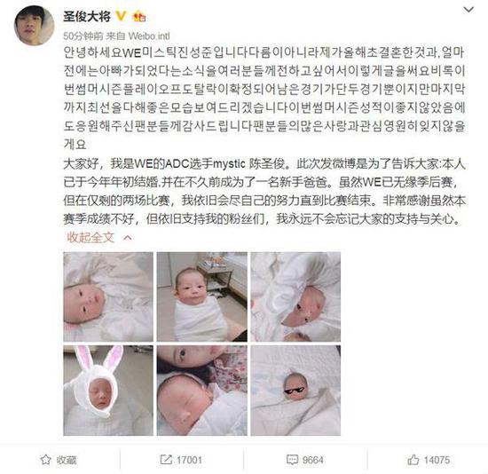 “大家好,我是WE的ADC选手Mystic 陈圣俊。此次发微博是为了告诉大家:本人已于今年年初结婚,并在不久前成为了一名新手爸爸。虽然WE已无缘季后赛,但在仅剩的两场比赛,我依旧会尽自己的努力直到比赛结束。非常感谢虽然本赛季成绩不好,但依旧支持我的粉丝们,我永远不会忘记大家的支持与关心。”