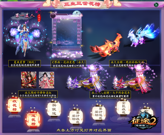 同时全区送放海量福利:64包、传说节、家族团圆包/家族神鸡、节日在线大抽奖、收集交换活动、双倍天降鸿福、全新七夕特别版三生三世花榜等,为玩家送出稀有图鉴、银子、全新花朵环绕特效、永久动态C界面以及永久七夕限时英雄美人卡命名权!你值得拥有