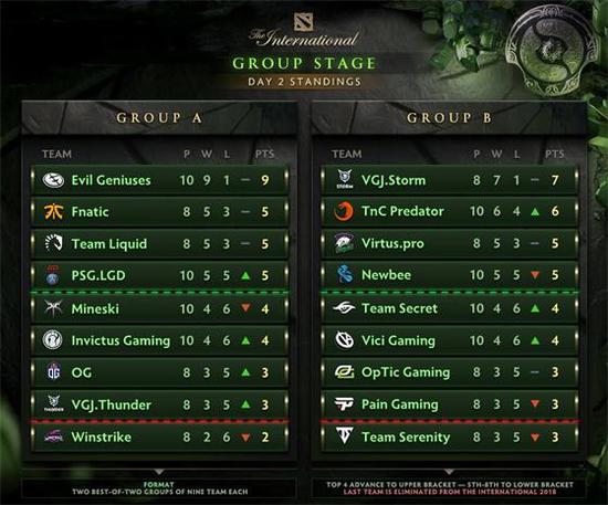 8月17日,TI8小组赛第二日比赛全部结束。这轮比赛中两组头名战队并没有发生变化,EG跟VGJ.S依然暂居榜首,EG战队更是强的可怕,10场比赛仅输一场。这个架势打下去EG保底能进入胜者组,想要保持小组第一名也并非难事。整体看下来,A/B两组也是非常整齐的第一名北美、第二名东南亚、第三名欧洲/CIS、第四名中国战队。