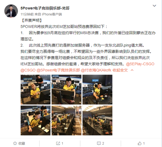 5POWER电子竞技俱乐部,在微博声明放弃IEM 芝加哥站预选赛。
