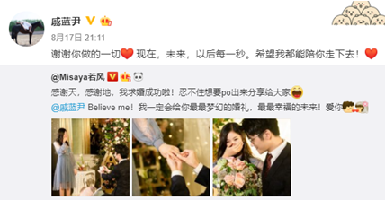 上周四,前WE队长,现电竞艺人Misaya若风才在微博上正式公开恋情,发布“瞬间爆炸,完成脱单”的甜蜜宣言,昨天,若风就趁七夕情人节之际,直接向女友戚蓝尹展开求婚攻势,光速定下终身,这波迅雷不及掩耳之势的操作让一众日常催婚的粉丝直呼“进度超速”。