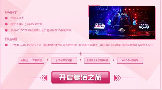 WUCG2018全国线上公开赛期间,王者荣耀大众组、英雄联盟、QQ飞车手游 (王者荣耀女子组除外)的纯女子组战队如在16强比赛前战败,则均可获得一次16强名额争夺的机会!所有16强比赛前战败的纯女子战队,将采用公开赛相同赛制,最终决出的冠军将直接晋级到全国线上公开赛参与16强争夺。通过七度空间的女子战队复活机制,WUCG在创新玩法上更前进一步,也兑现了七度空间为中国女子电竞崛起的努力。