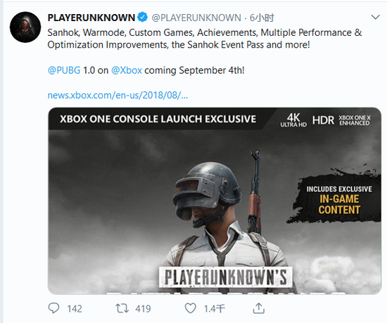 Twitter原文:Sanhok,Warmode,自定义游戏,成就,多项性能和优化改进,Sanhok事件和更多内容!Xbox1.0版本9月4日见!