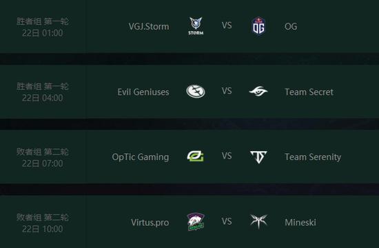 胜者组第一轮的比赛结束后将进行两场败者组第二轮的较量,中国战队Team Serenity会在07:00对阵OpTic,VP战队则在最后一场对阵Mineski。