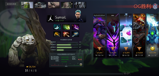 至少在决胜局的前20分钟,我确实信了剧本的存在。看着Sumail那个24分钟20杀的小小,OG似乎分分钟要被碾压出局。第一次变化是双方的肉山团——的确,Sumail在队友倒了三个的情况下一个人灭了OG。第二波是在37分钟,Ana的幽鬼在下路一个人拆了一路,而大爹则留住了EG的三个英雄。但即便是到了那个时候,我也不相信OG能够翻盘。不过,RTZ的经济倒是给了OG很大的希望。玩过幽鬼的人都知道,龙心20级之前不被破三路,一切皆有可能。前半段送到超鬼的汤普森在拿到A仗后有了声音,而S4的小鹿已经进入了这个英雄的疲软期。属于幽鬼的时间终于到来了!Sumail似乎没有料到,自己的小小在幽鬼的面前居然是那么的不堪一击。前期所有的压抑都是值得的,当Sumail在树林中与Ana捉迷藏的时候,他浪费了出击的最佳时间;前期所有的折磨都是值得的,当幽鬼买活大招降临的那一刻,时间凝固了!这可能是本届TI到目前为止最梦幻的一场比赛,OG用中国天梯的老路子战胜了小组赛霸王EG。反击光环带折射,Ana的肉搏幽鬼创造了奇迹。恭喜OG,感谢你们带来的精彩比赛!