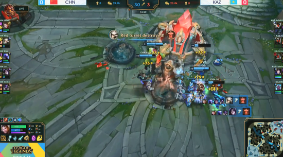 接下来就完全是中国团队的碾压局面了,对方毫无还手之力。10分钟经济领先就到达了近一万。16分钟破掉一路高地顶着门牙塔团灭了对手后一波结束了比赛!