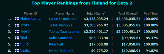 此外,因为OG队内的中单选手Topson和四号位JerAx都是芬兰选手,所以在他们这次夺冠后,芬兰一跃成为了目前DOTA2中获得奖金数第三高的国家。再算上TI7夺冠的Liquid一号位MATUMBAMAN的话,这三位是芬兰仅有的奖金突破10万美元的DOTA2选手,不过他们身上都带着TI冠军的光环,一国三冠军,芬兰这个国家在DOTA2上的实力也不弱了。