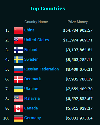 而目前DOTA2奖金最多的国家依然是中国,一共获得了5473万美元的奖金,排在第二的是美国,目前的奖金总额为1197万美元。