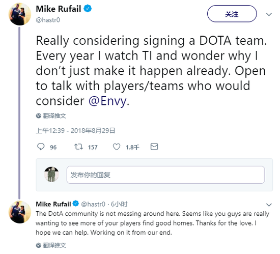 而今天,Envy俱乐部的CEO hastr0在推特上表示十分想要组建一支DOTA战队,每年在观看TI的时候他的脑中都有过这个念头,而今年他似乎准备来真的了。Envy俱乐部正式公开接洽那些有意向的DOTA2选手和战队,他们或许会自己组建队伍,也可能会直接收购一支已有的队伍。