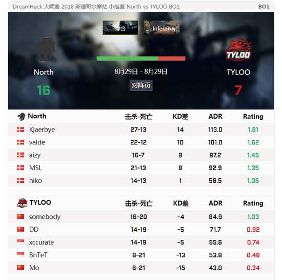 DreamHack大师赛斯德哥尔摩站于今日正式开战,众多世界强队齐聚本次大赛,中国战队TYLOO首轮比赛的对手是丹麦雄狮North,地图经过BP后最终来到INFERNO。