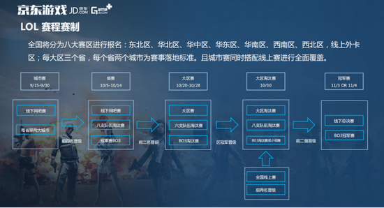 本届京东杯电子竞技大赛S2是2018年下半年最令人期待的非职业电竞赛事之一。本次大赛,共覆盖八大赛区,二十四个省。城市赛同时搭配线上赛进行全面覆盖,线上赛事的前两名将直接参与到大区淘汰赛,与各路豪强向着总决赛的舞台发起冲击。9月15日-9月30日将在全国范围内进行网吧城市预选赛,获胜的战队将晋级到省赛及大区赛。大区赛的各支晋级战队将于10月30日与线上赛的两支晋级战队一起,在总决赛中一决雌雄!