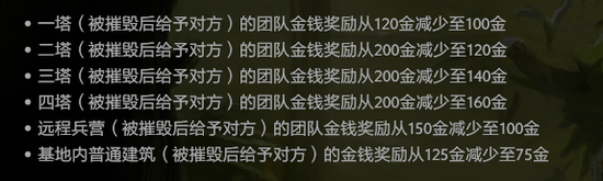 3. 经济落后队伍获得的范围金钱不再随着全队财产总和差异而变化,只与阵亡英雄自身的财产总和相关。之前队伍中核心的经济很高将会导致辅助阵亡给予敌人相当多的金钱。
