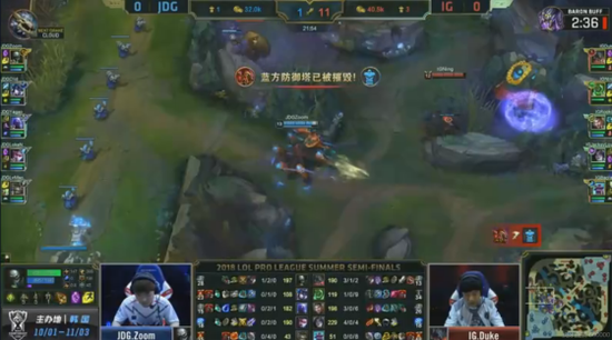 20分钟JDG劣势期试图进攻上路二塔,塔下想要击杀剑魔的JDG直接找到IG反打,最终惨遭0换5丢掉大龙。IG经济领先直接来到8000。22分钟JDG轻松的滚起雪球破掉了中路的高地水晶。