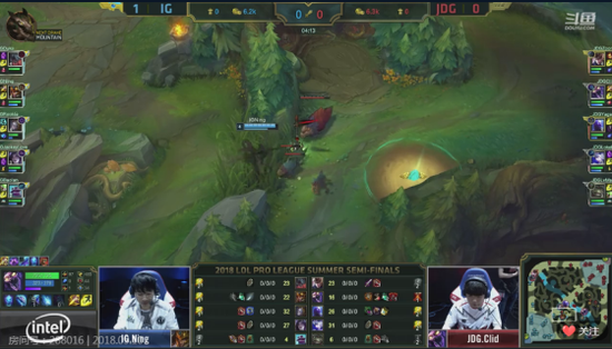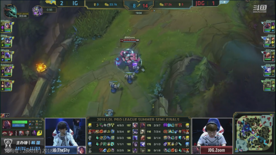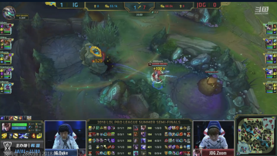 比赛前期,双方打的都很凶,双方上路3打3。IG处理的更好一点完成了3换2,不过JDG的瑞兹拿到了两个头。10分钟,JDG在下路也打开了局面,连续击杀对面的青钢影和塔姆,拿掉了下路的一塔。不过IG也通过单带拿掉了JDG的上路一血塔,双方整体经济持平。