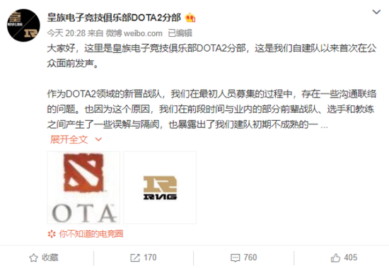 作为DOTA2领域的新晋战队,我们在最初人员募集的过程中,存在一些沟通联络的问题。也因为这个原因,我们在前段时间与业内的部分前辈战队、选手和教练之间产生了一些误解与隔阂,也暴露出了我们建队初期不成熟的一面。在此,我们向广大DOTA2玩家、电竞爱好者及业内人员,表达我们诚挚的歉意。