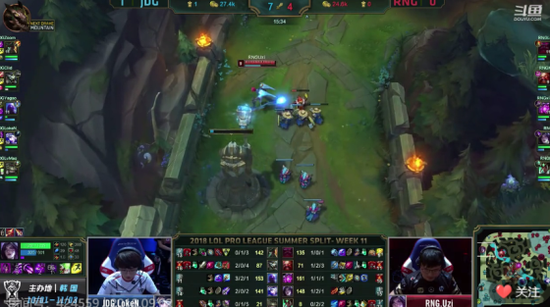 比赛来到决胜局,双方都打得非常的保守和谨慎,一直在平稳发育,15分钟,在RNG释放了峡谷先锋以后,JDG在中路处理,同时RNG来到下路抓到船长给UZI拿到了一血,但随后,JDG就发起了反攻,在船长复活后,JDG利用时光大招在打团中的优势打出了一波0换3并且拿下了中路一塔。