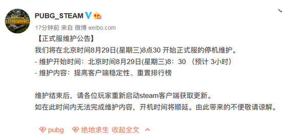 我们将在北京时间8月29日(星期三)8点30 开始正式服的停机维护。