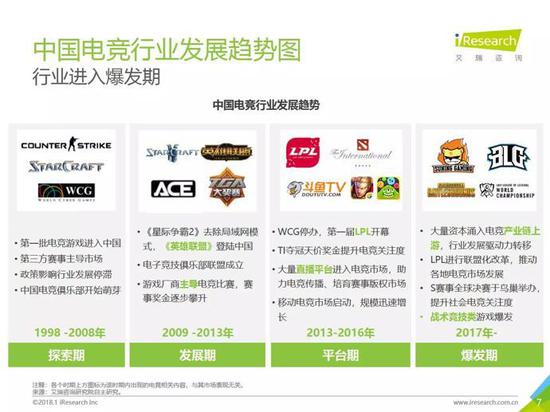 今年2月iResearch对我国电竞行业的发展趋势给了一份分析报告,从去年开始国内的电竞行业进入了爆发期。2017年,中国电竞行业的整体市场规模已经超越了650亿元。