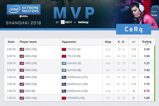 NRG战队天才选手CeRq被HLTV和betway评为IEM 上海站最有价值选手。