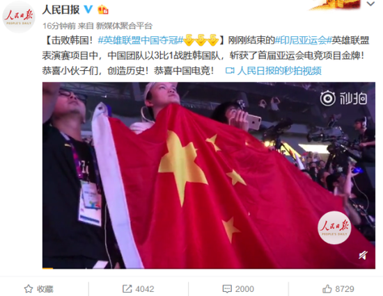 人民日报和共青团则发布了现场的视频,选手们举起国旗在雅加达的舞台上,一起享受着现场观众的大声呐喊:我们是冠军。