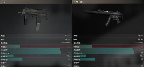 而在枪械的数据方面,我们可以通过一组对比数据看到,MP7在伤害方面稍高,其余基本和MP5SD数据相同,这也是V社对于平衡的一种试探,虽然数据相同点很多,但是在游戏里的体验则截然不同。