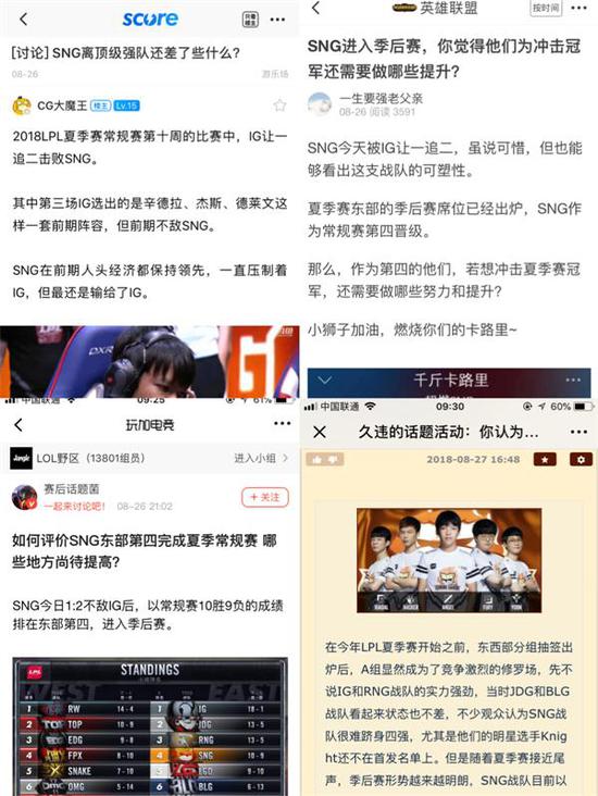 虽然SNG在此次比赛中遗憾负于iG,但是面对这支东部最强战队,SNG也是打出了自己的风采。尤其是在第一局和第三局的开局,让我们看到了SNG作为一匹东部赛区黑马的潜力。然而,SNG现阶段在比赛中出现的问题也是有目共睹的,为此虎扑、NGA、玩加电竞、Score等著名社区的电竞板块均开贴讨论SNG战队实力。