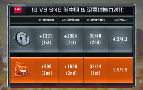 另一个让玩家们比较担心的问题是SNG在中路、下路对线上的劣势。结合SNG和iG第三局比赛数据可以看出,即使SNG在前期取得优势的情况下,在补刀数量上还是和iG有100-200的差距。虽然这往往和英雄、所选阵容有关,但是能够进入季后赛的队伍在对线能力方面可是毫不含糊,SNG必须增强自己在对线上的实力,才有在季后赛中更进一步的可能。