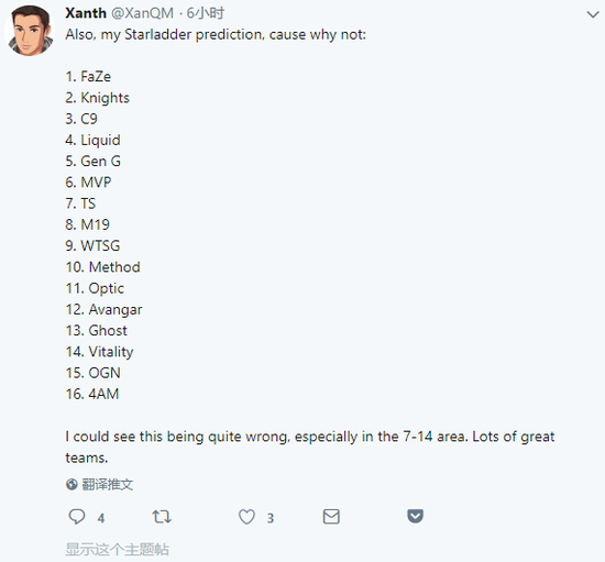 他也表示,“我也可能错得离谱,尤其是第7到第14名。有太多强队。”看起来,Xanth对第1名到第6名以及倒数两名的队伍还是比较有把握的。