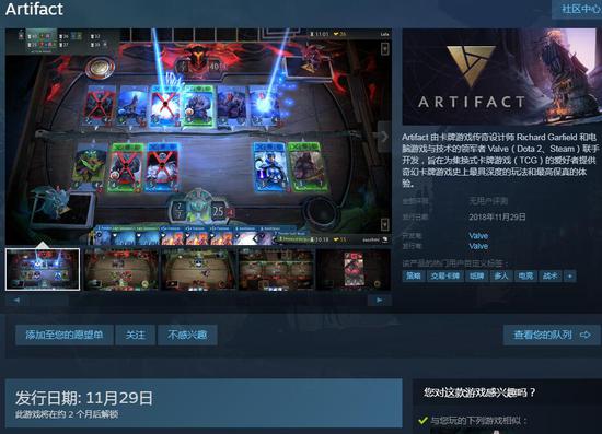 Artifact是取材于刀塔2的卡牌游戏,在Ti7国际邀请赛上首次公布,在今年Ti8上,V社老板G胖宣布每个到Ti8现场的观众将获得一份免费的Artifact卡牌。Artifact是V社五年来的第一款自研游戏,V社对于这款游戏寄予厚望,万智牌之父Richard Garfield也被请来入伙,游戏的品质值得期待。