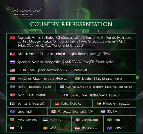 中国的参赛选手是最多的,在所有90名参赛选手中占到了28位,几乎接近总人数的三分之一(如果算上国籍为其他国家的华人,比如EE、Sneyking等人,将超过三分之一)。中国人口基数大是一方面,更重要的还是因为中国DOTA水平在世界处于顶尖位置。想想看,隔壁的阿三人口同样有10亿,但是一个选手也没有。