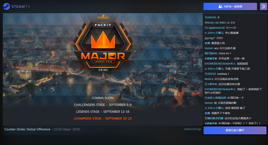 2018伦敦Major比赛,官方新增了SteamTV直播平台,Steam TV可令中国玩家体验到1080P高清画质,无需每场比赛都要重新手动进入,且将解决以往玩家在GOTV上观看比赛因同时在线人数过多而掉线的问题。还能邀请好友一同观看Major大赛盛况哦~
