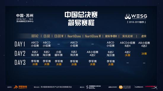 10月1日将进行绝大多数项目的小组赛赛程,10月2日则会开始各个项目的淘汰赛,同时实况足球和虚荣将在第二天决出冠军,10月3日则是剩余其他项目的冠军争夺战。
