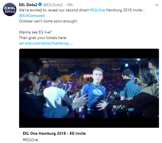 ESL One官方在推特上揭晓了第二支受邀参加汉堡站2018的队伍——EG。