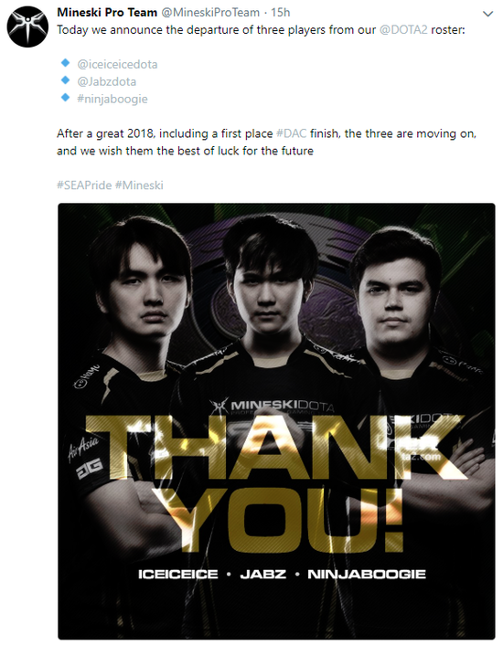 Mineski通过他们的官方推特发布消息,称在本次转会期间,队内的iceiceice、jabz和ninjaboogie三位选手离队。