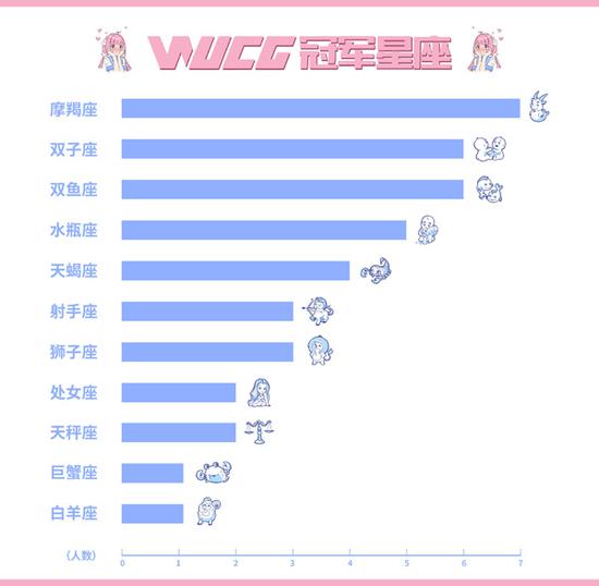大家通过线上直播都已经看到这8支队伍40位女子校园冠军们的精彩操作。在对女生们实力赞口不绝的同时,双子座元七七同学对于星座和玄学非常好奇,究竟这些校园冠军们到底是什么星座呢。元七七统计了这8支队伍40位“女圣斗士”,最终发现摩羯座人数独占鳌头,有7位校园冠军女生是摩羯座,在车田正美的漫画中,摩羯座修罗实力出众,仅论攻击力的话也是黄金圣斗士当中数一数二的。而这一次摩羯座在WUCG女子组中也抢尽了风头,成为WUCG目前为止“最强星座”。