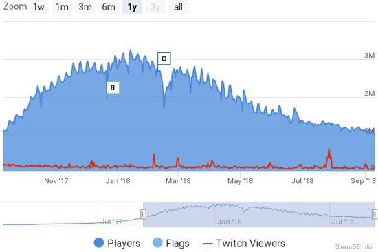 自去年春节以来,《绝地求生》玩家活跃度就一路狂跌并从此一蹶不振,连续8个月狂跌不止。峰值玩家数从历史最高的323万跌到现如今的不足100万。平均在线玩家数从158万跌到了现如今的59万。