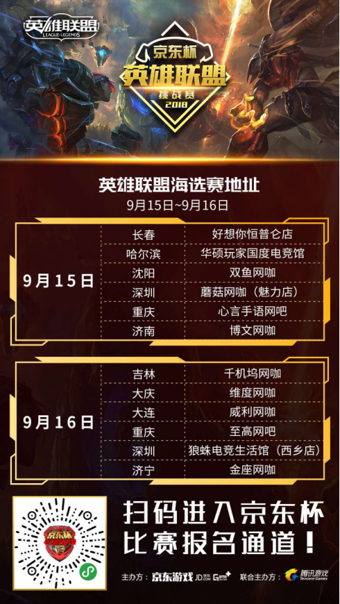 由京东游戏和腾讯游戏联合举办的2018京东杯电子竞技大赛S2于8月27日正式启动报名。本届京东杯S2《英雄联盟》项目共覆盖八大赛区,二十四省,可谓全国年度最大的非职业电竞赛事。盛况空前的全民电竞舞台,还未开始就已经勾起了所有人的心。自报名开启后,无数抱有实力与热爱的玩家,纷纷参与报名。短时间内迅速集结了数百支来自全国各地的民间队伍。他们将在未来的两个月里,踏上冲击冠军的征程。如果你渴望舞台与荣誉,如果你天赋出众实力强劲,就千万不要错过本次京东杯电子竞技大赛的舞台,带上你的队友,向着总决赛的舞台和高额的赛事奖金发起冲击吧!扫描下方二维码,与你的小伙伴一起参与这场年度最大的全民电竞狂欢。来报名吧,来开始这场盛大的典礼!2018京东杯电子竞技大赛 英雄联盟挑战赛已经开启!