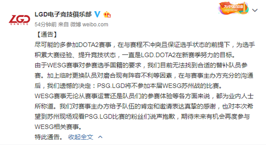 由于WESG赛事对参赛选手国籍的要求,我们目前无法找到合适的替补队员参赛。加上临时更换队员对磨合现有阵容不利等因素,在与赛事主办方充分的沟通后,我们遗憾的决定:PSG.LGD将不参加本届WESG苏州战的比赛。