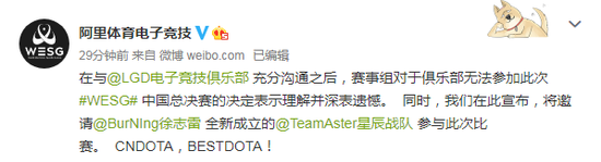 此后,WESG主办方阿里体育电子竞技转发微博称,在与@LGD电子竞技俱乐部 充分沟通之后,赛事组对于俱乐部无法参加此次#WESG# 中国总决赛的决定表示理解并深表遗憾。 同时,我们在此宣布,将邀请@BurNIng徐志雷 全新成立的@TeamAster星辰战队 参与此次比赛。 CNDOTA,BESTDOTA!