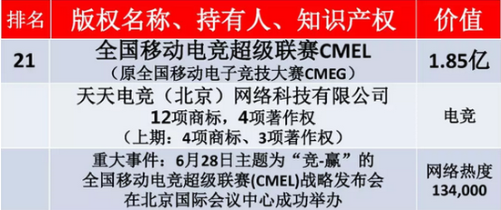CMEL全国移动电竞超级联赛自今年6月28日成功举办主题为“竞-赢”的战略发布会以来,行业影响力不断增强,品牌价值进一步提升。在体育版权价值研究院最新发布的2018年9月中国社会办赛原创体育(赛事)版权价值榜50强名单中,CMEL以1.85亿名列21位,赛事版权价值得到行业高度认可!