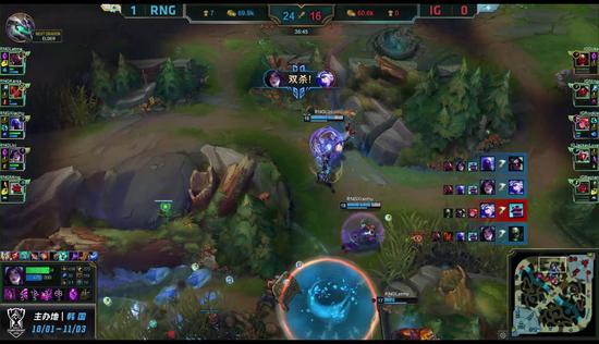 [01:40] RNG开局有特殊设计,双人组换线到上路,三人直入iG红Buff野区,赛恩利用被动吃掉了自家的红,tp到下路线上。iG想三人越塔击杀赛恩却被反拿到一血。