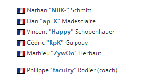 这支新法国队的队员包括目前被G2放置在冷板凳上NBK-和apEX,离开EnVyUs以后还没有找到新东家的Happy与RpK,以及被称为是法国CSGO的希望的17岁少年ZywOo。而教练将由faculty担任,他在CS1.6时代曾效力于eSport-Eu, aAa以及eXtensive等战队。