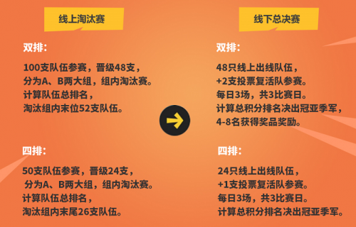 四排赛总共50支队伍参赛,分为A、B两组,最终积分靠前的24支队伍晋级线下,根据总积分排名决出四排赛的冠亚季军。