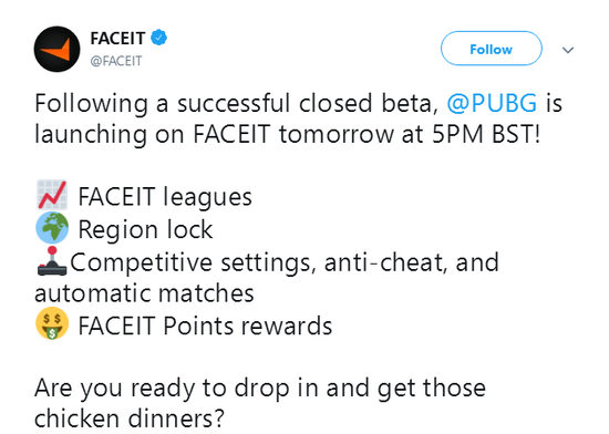 Faceit官方发布推文,正式宣布PUBG在Faceit平台结束测试,将于英国夏令时下午5点,即北京时间9月29日零时正式在Faceit向公众开放。玩家可以在Facelt中查看自己的游戏排名和数据统计。同时区域锁定功能也正式启动。Faceit为了给玩家更好的游戏体验也推出了竞赛模式、反作弊以及游戏匹配功能。现在通过Facelt平台进行游戏还可以获得积分奖励。你做好吃鸡的准备了吗?